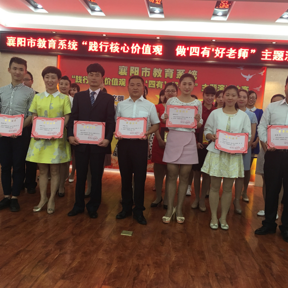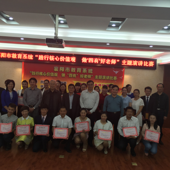 5月27日,在四中义教部报告厅,由襄阳市教育局、市教育工会主办的全市“践行核心价值观,做‘四有’好老师”为主题的师德演讲比赛中,陈竹君老师代表学校参赛并荣获一等奖。