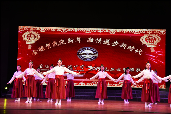 金猪贺岁迎新年 激情迈步新时代 我校欢庆2019元旦文艺联欢会精彩绽放 12月28日上午,襄阳剧院华灯炫彩、歌舞飞扬,处处洋溢着节日的欢乐与喜庆。我校主题为“金猪贺岁迎新年,激情迈步新时代”的2019年元旦文艺联欢会在这里精彩绽放。七、八年级全体师生、部分学生家长欢聚一堂,共同迎接新年,展望美好未来。校领导及七、八年级家委会成员观看了文艺联欢会。 伴随着恢宏激越的器乐合奏《春江新韵》,联欢会在激情热烈的氛围中拉开帷幕。董事长李东林先生致新年贺辞,他首先向关心我校发展的社会各界人士表示崇高的敬意,向全体师生致以节日的问候,向支持协助本次活动的家长表示衷心的感谢。李董事长总结了我校在2018年中考中取得的优异成绩和连续取得中考六年红胜红的佳绩。李董事长寄语:“2019让我们伴着欢歌笑语,走向更加辉煌的明天,预祝本次联欢会圆满成功,祝愿大家幸福如意!” 联欢会形式多样、内容丰富,精彩纷呈,高潮迭起。歌曲、舞蹈、群口相声、小品、快板、汉服表演、配乐诗朗诵、情景剧、器乐、非洲鼓等十余个类别33个节目,各有特色、大放异彩,为师生们带来了一场视觉与听觉的华美盛宴。 激昂的音符流淌,动人的旋律跃动,戏曲表演《花木兰》将观众带入精彩的巾帼英雄世界;非洲鼓《莫里巴亚萨》极具异域风情的表演吸引了众多观众的眼球;舞蹈社团藏族舞《唐古拉风》尽显民族风情;相声《熊孩子》妙趣横生、爆笑不断;情景剧《我们的校园生活》以温馨的场景、活力俏皮的动作,反映了多姿多彩的校园生活;汉服表演《锦绣华裳》向同学们展示了我国古代服装配饰的变迁,展现了中华传统文化的魅力;街舞《up down Funk》动感十足、活力四射,迸射着青春的激情;配乐诗朗诵《我骄傲我是中国人》引发了在场师生爱国爱家的强烈共鸣;七年级老师们带来的交谊舞《爱的华尔兹》优美动人,将老师们高雅的风度表现的淋漓尽致;八年级老师们的健美操《活力无限》动感十足,活力四射,将文艺联欢会会推向高潮。结尾现代舞《辉煌中国》舞出了莘莘学子爱国之心,为联欢会画上了圆满的句号。联欢活动也得到马王庙社区的大力支持,互动环节举行了创文知识有奖竞猜活动,学生踊跃抢答创建全国文明城市应知应会知识,正确率达到100%,受到社区领导的高度赞扬。 本次元旦联欢活动既气势恢宏,又贴近校园生活,以师生喜闻乐见的艺术形式展现了我校师生昂扬奋发、积极进取的精神状态。同时,联欢会还在云上襄阳进行了全网直播,众多家长通过网络观看了节目,他们在直播中频频互动,纷纷表达对我校师生的节日祝福与问候。 此次汇演活动由学工处组织,节目全部是学生自编、自导、自演,充分展示了五中实验中学学生的核心素养,同时也得到了家长的大力支持,拉近了家校之间的距离。我校一直高度重视学生素质的全面发展,联欢会也充分展示了我校推行素质教育的累累硕果。 摄影/撰稿:程诗佳 七年级器乐社团器乐合奏 春江新韵 主持人 张书扬 黄紫璇 杨余 许倩雯 董事长致辞 八(2)班鼓乐表演 激舞飞扬 七(6)班舞蹈 青春时光 七(1)班戏曲表演 花木兰 七(2)班舞蹈 鬼步芭蕾 八(11)班现代舞 Yes or yes 八年级舞蹈社团藏族舞 唐古拉风 七(9)班配乐诗朗诵 古道新路 七(3)班情景舞蹈 欢乐小人舞 八(8)班节奏快板 论语新编 八(10)班街舞 up down Funk 七(13)班相声 熊孩子 八(5)班舞蹈串烧 ninety-eight 八(1)班舞蹈 明日歌 八(4)班合唱 稻香 七(8)班非洲鼓 莫里巴亚萨 创文知识问答 七年级教师交谊舞 爱的华尔兹 七(11)班印度舞 节庆欢鼓 八(6)班情景剧 遇见八6 七(7)班群口相声 四大才子 八(9)班创意操 舞动青春 八(7)班朗诵表演 千字文 七(12)班现代舞 燃烧我的卡路里 七(4)班情景剧 游子吟 七年级家委会广播操 广播操 八(13)班歌曲演唱 苔 七(5)班配乐诗朗诵 我骄傲我是中国人 八年级教师健美操 活力无限 八(12)班现代舞 倾杯 七(14)班汉服表演 锦绣华裳 七(10)班情景剧 我们的校园生活 八(14)班沙画表演 老师老师,我爱您 八(3)班现代舞 辉煌中国 校领导与演员们集体合影 襄阳五中实验中学2019元旦文艺汇演视频